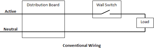 With conventional wiring, the mains power (120 / 230 V) is wired from the distribution board (DB) to the load (for example, a ceiling light) via a wall switch.