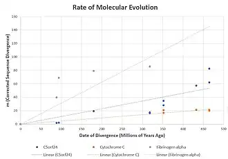 The C5orf24 protein is not present in plants or fungus but orthologs have been found in mammals, birds, reptiles, amphibians, as well as bony fish (Osteichthyes) and cartilaginous fish (Chondrichthyes).[7] There is evidence for an orthologous domain in jawless fishes (Agnatha) and invertebrates.[7] Comparison of m values (corrected rate of divergence) between C5orf24 (NP_001129058.1), Cytochrome c (NP_061820.1) which has a slow rate of evolution,[30] and Fibrinogen alpha (NP_000499.1) which has a fast rate of evolution[31] demonstrated this protein evolved at fairly slow rate especially when fish sequences are excluded.[6][7][32][33][34]