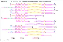 There are 17 different mRNAS produced from the CCDC130 gene. 13 of these mRNAs come from alternative splicing, and the other four are unspliced.[6] There have been four alternative promoters, five alternative polyadenylation sites, and four alternative last exons described.[6] Two instances of intron retention have been described. 14 different proteins have been identified from the CCDC130 gene, all of which contain the DUF572 domain but only five seem to show the coiled-coil stretch. The other three mRNAs were very low quality and were not translated. It was also noted that this gene has the potential to encode several non-overlapping proteins. 45 SNPs have been documented for CCDC130 on NCBI: 29 missense mutations and 16 synonymous mutations that don't change the amino acid.[6]