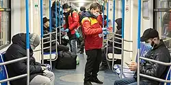 On 29 March, Moscow issued a stay-at-home order for all residents starting on 30 March. Muscovites were not allowed to leave their homes except in cases of emergency medical care and other threats to life and health, to travel to work for those who are obliged to, to make purchases in the nearest shop or pharmacy, to walk pets at a distance not exceeding 100 metres from the place of residence, as well as to take out the garbage. People were instructed to keep a distance of 1.5 metres from other people. Those recently unemployed will receive 19,500 rubles a month.[89][90] After that, a similar regime was introduced in Moscow Oblast at 20:00 MSK on 29 March.[91]