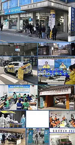 From top to bottom then from left to right: a queue in front of a pharmacy in Wonju for the distribution of masks, a drone of disinfection in Seongnam, a closed elementary school in Daegu, protest inscriptions against Shincheonji on a car, video call between members of the South Korean government, manufacturing of masks in Busan, 2020 South Korean legislative election, admission of a symptomatic patient to a hospital in Busan, portable medical negative pressure isolation stretcher in a fire station in Hoengseong County, firefighters' training in Daegu, thermal camera at the entrance to Wonju hospital, temperature check at Incheon International Airport, drive-through testing in Gyeongju.