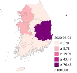 The COVID-19 pandemic in South Korea is part of the worldwide pandemic of coronavirus disease 2019 (COVID-19) caused by severe acute respiratory syndrome coronavirus 2 (SARS-CoV-2). The first case in South Korea was announced on 20 January 2020.[3] The number of confirmed cases increased on 19 February by 20, and on 20 February by 58[4] or 70,[5] giving a total of 346 confirmed cases on 21 February 2020, according to the Korea Disease Control and Prevention Agency (KDCA), with the sudden jump mostly attributed to "Patient 31" who participated in a gathering at a Shincheonji Church of Jesus the Temple of the Tabernacle of the Testimony church in Daegu.[5][6]