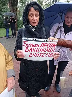 On 22 September 2021 Health Minister Viktor Liashko disclosed that his ministry was planning to approve a list of professions subject to mandatory vaccination (against coronavirus infection).[80] This list was intended to entice more teachers to get vaccinated (49% of education workers had received at least one dose of a COVID-19 vaccine); others on the proposed list (medical workers, the Armed Forces, the Interior Ministry, the National Guard of Ukraine) had already a high rate of vaccinated (80% to 90%).[80] It was decided that education workers had until November 2021 to get vaccinated against COVID-19; if they did not they would be suspended from work for a period of quarantine without pay.[81]