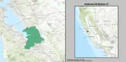 Under the 2020 redistricting, California's 17th congressional district takes up the Tri-City area of the San Francisco Bay Area, taking up the western borders of Alameda and Santa Clara Counties. The area in Alameda County includes the south side of the city of Fremont, and the city of Newark. The area in Santa Clara County includes the north side of the city of San Jose; part of the census designated place Alum Rock; and the cities of Milpitas, Santa Clara, Sunnyvale, and Cupertino.