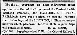 - ^ "California Central Railroad". cndc.ucr.edu. Placer Herald, Volume 13, Number 35. April 29, 1865. Retrieved July 11, 2021.
