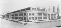 The one-story plant building measured 110 by 150 feet (34 m × 46 m) in size, and was of reinforced concrete construction. There was a mezzanine floor on three sides. The ceiling measured 37 feet (11 m) in height, and the sides were largely made up of windows. The all white exterior was surrounded with lawn, flowers, and shrubs. A pergola, 110 feet (34 m) in length, reached from the southern extremity of the building to Romaine Street and was intended as a dining area for employees. On two sides of the building, there was a wide concrete driveway.[2]