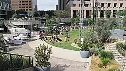 California Plaza is a business office and commercial complex in the Bunker Hill District of downtown Los Angeles, California. It consists of two skyscrapers, 1 Cal Plaza and 2Cal, previously named One California Plaza and Two California Plaza. The plaza is also home to the Los Angeles Museum of Contemporary Art (MoCA), Colburn School of Performing Arts, the Los Angeles Omni Hotel, and an entertainment/park plaza. A third tower, Three California Plaza was also planned. It would've been a 950-foot (290 m) tall tower, but was later scrapped in the 1990s due to a lack of financing.