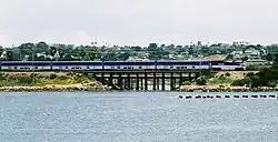 A southbound Pacific Surfliner train in 2005 at Carlsbad, south of Oceanside.