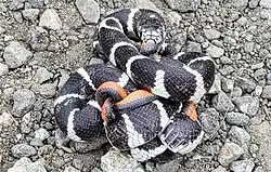 The California kingsnake is cathemeral; it may be active day or night depending on ambient temperatures.[6][12] When disturbed, California kingsnakes often coil their bodies into a ball[13] to hide their heads, hiss, and rattle their tails, which can produce a sound somewhat resembling that of a rattlesnake. When they are nervous they tend to twitch their tails.[14] They are considered harmless to humans, but if handled it is common for this species to bite, as well as to excrete musk and fecal contents from their cloaca.[15] It is also common for this musky odor to be excreted when the snake feels threatened.[6] California kingsnakes are considered to be generally solitary, but when mating season or brumation is in process, they group together.[16]