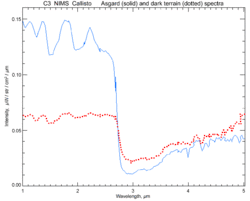 Callisto's surface has an albedo of about 20%.[7] Its surface composition is thought to be broadly similar to its composition as a whole. Near-infrared spectroscopy has revealed the presence of water ice absorption bands at wavelengths of 1.04, 1.25, 1.5, 2.0 and 3.0 micrometers.[7] Water ice seems to be ubiquitous on the surface of Callisto, with a mass fraction of 25–50%.[17] The analysis of high-resolution, near-infrared and UV spectra obtained by the Galileo spacecraft and from the ground has revealed various non-ice materials: magnesium- and iron-bearing hydrated silicates,[7] carbon dioxide,[52] sulfur dioxide,[53] and possibly ammonia and various organic compounds.[17][7] Spectral data indicate that Callisto's surface is extremely heterogeneous at the small scale. Small, bright patches of pure water ice are intermixed with patches of a rock–ice mixture and extended dark areas made of a non-ice material.[7][13]