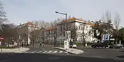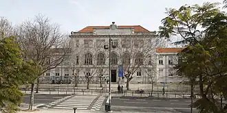 The lyceum of Camões was constructed to substitute the old National Lyceum of Lisbon, created in 1902, and inadequate for the teaching needs and number of students.[1] At the time of its inauguration there was a general consensus that the building had beautiful conditions and a model for hygiene and pedagogic teaching, as reported by the newspapers.[1] Critics noted that the school was isolated on the square (the Largo do Matadouro Municipal), which was a natural zone on the edge of urban expansion and little accessible.[1] The lyceum, owing to its purpose-built nature (from scratch and specific to teaching) was an architectural educational reference, both formally and esthetically, respecting the functional necessities of the site.[1] The great number of students that this urban lyceums received, and that hygiene theories at the time, meant that there was an obligation to include physical education classes, resulting in a modular system of pavilions used for complimentary classes, with patios and exterior recreational spaces. The principal wings, used for traditional teaching rooms were linked to new sporting pavilions, gymnasium, change rooms and projected swimming pool (which were unique for the country at the time).[1] The lyceum was a public utility, functional and rationalist. It was projected to integrate into the urban fabric, albeit isolated initially.[1] Ventura Terra delineated a construction model that was more simple then the habitual designs, responding to the a request by the first rector of the Central Lyceum, Rui Teles Palhinha: