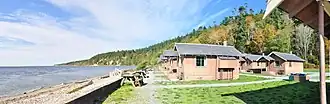 The archaeological record shows that Native Americans were active along the shoreline now known as Cama Beach for thousands of years before the arrival of European settlers.[3] The discovery of human remains and artefacts in the early 21st century threatened to scuttle the creation of a state park at the site.[4] In 1934, LeRoy Stradley opened a fishing resort with some two dozen cabins that could be rented by vacationers at a modest cost. After his death four years later, as many other Camano Island resort properties came and went, Stradley's family continued to operate Cama Beach Resort until 1989.[5] Once closed, Stradley's granddaughters sold the resort, which had fallen into disrepair,[6] to the state of Washington at a fraction of its estimated worth,[4] contributing some of their earnings to the property's rehabilitation.[3]