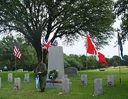 Thirty-nine officers and cadets died in Texas. Eleven British, Canadians, and Americans remain there, reinterred in 1924 at a Commonwealth War Graves Commission cemetery plot in Greenwood Memorial Park, Fort Worth.[10] The plot is in Section 5 of the cemetery, at 32-45-47, 97-21-48. Also interred there are one of their comrades who died in 1975, and the daughter of a Canadian instructor who died as a baby in 1918. A stone monument serves as a focal point on Memorial Day in May of odd-numbered years, when friends of the cemetery support a moving Remembrance Service, at which people from the three nations remember the sacrifice of those buried there.