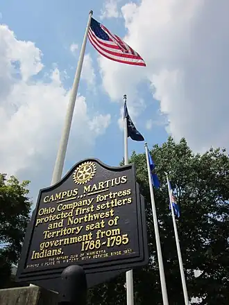 Campus Martius was a defensive fortification at the Marietta, Ohio settlement. It was home to Rufus Putnam, Benjamin Tupper, Arthur St. Clair, and other pioneers from the Ohio Company of Associates during the Northwest Indian War. Major Anselm Tupper was commander of the Campus Martius during the war.[2][3] Construction began in 1788 and was fully completed in 1791. The Campus Martius was located on the east side of the Muskingum River and upriver from its confluence with the Ohio River. A firsthand description of the fort is provided in Hildreth's Pioneer History,