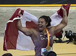 Rogers entered the 2023 World Athletics Championships as a contender for the title, albeit with Andersen having recorded the five longest throws of the year to that point.[27] After qualifying to the final, she won the gold medal based on her first throw of 77.22 metres. In so doing, she became the second Canadian woman to win gold at the World Athletics Championships, after Perdita Felicien's 2003 hurdles title.[28] As well, she was part of a Canadian sweep of the hammer titles in Budapest, along with Ethan Katzberg's unexpected gold medal in the men's event.[29] With her world championship gold in hand, she shortly afterwards acquired sponsorship from Nike, saying "I signed my name on the dotted line the day after the final."[30]