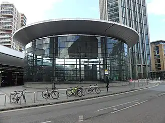 The station, which was the first to be designed in the Jubilee line Extension project, has been described by the Hong Kong MTR's chief architect Roland Paoletti as "the only station on the JLE that has been built to the strict engineering economies of the specification of a Hong Kong interchange station." Above ground, its most salient feature is a striking glass "drum" 25 m (82 ft) across, which covers a deep opening descending almost to the Jubilee line platforms, 22 m (72 ft) below the surface. This feature was designed to allow natural light to reach deep into the station, a design principle common to many of the stations on the Jubilee line Extension. The drum was designed and constructed by Buro Happold.[11] It is notably similar to the brick drum designed by Charles Holden for Arnos Grove station on the Piccadilly line in the 1930s, but is much more oriented towards the entry of daylight.[14]