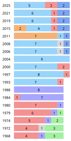 | Election | Liberal | Bloc Québécois | New Democratic | Conservative | Green | PC | Reform / Alliance |