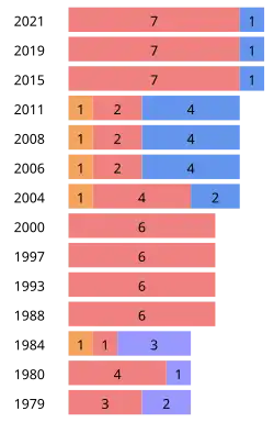 | Election | Liberal | Conservative | New Democratic | Green | PC | Reform / Alliance |