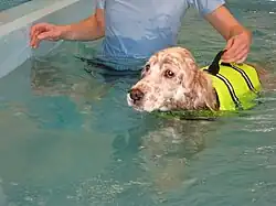Hydrotherapy techniques use water as a tool to improve muscle and joint function in animals. These techniques include but are not limited to swimming and underwater treadmill. Swimming allows an animal to work several muscles at once while stretching further than walking on land would allow. This helps to build muscle and endurance and is a technique that minimizes stress on the joints. Underwater treadmill is used commonly in animal physical therapy. It provides the benefits of land exercises while decreasing the weight placed on the animal's limbs. Underwater treadmill and swimming can be very useful in dogs recovering from surgery, such as anterior cruciate ligament and cranial cruciate ligament repairs and break repairs.[19][2]