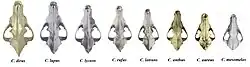 | 1st row: wolf (C. lupus), dog (C. familiaris); 2nd row: red wolf (C. rufus), eastern wolf (C. lycaon); 3rd row: coyote (C. latrans), golden jackal (C. aureus); 4th row: Ethiopian wolf (C. simensis), African wolf (C. lupaster). | |