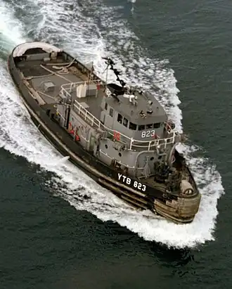 ![]() Aerial starboard bow view of Canonchet (YTB-823) underway at San Diego, 1 May 1983.