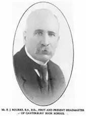 The school was opened in January 1918, in what is now the Primary School buildings, and began operating with two classes and 72 students, with Ernest John Rourke B.A. as Headmaster. The school was initially an intermediate high school (1st to 3rd year), and was therefore named Canterbury Intermediate High School. At its foundation, the search had already begun for a more appropriate site for the new school.[4]