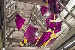 Capitol Hill station houses three pieces of public art as part of Sound Transit's system-wide art program. Mike Ross's Jet Kiss consists of a pair of disassembled, pink and yellow fighter jets that hang suspended above the platform.[75] The piece, which initially met with public backlash over its use of war planes,[71] references both the city's aviation industry and the city bird, the blue heron.[76] Capitol Hill cartoonist Ellen Forney has two murals in the station's north and west entrances, Crossed Pinkies and Walking Fingers, which portray simple, large hands outlined against a bright red background.[75] The murals, which consist of porcelain enamel on steel panels,[77] are meant to evoke a sense of "coming together [whilst] pulling apart", with both playfully leading passengers from street level into the station.[78][79] Forney designed Crossed Pinkies to echo Ross's Jet Kiss, sharing the "coming together" theme.[80] The station also had a pictogram that identified it on maps and signage, featuring the rainbow flag to honor the neighborhood's gay and lesbian community.[81] The pictogram was retired in 2024 and replaced by station numbers.[82]