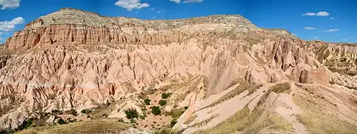 The modern region of Cappadocia is famous for the churches carved into cliffs and rock faces in the Göreme and Soğanlı valleys.[41] The region is popular with tourists,[43] many of whom visit the abandoned underground cities, houses and Greek churches carved and decorated by Cappadocian Greeks centuries ago. The formerly Greek town of Güzelyurt (Karvali) has become popular with tourists who visit the abandoned stone mansions built centuries ago by wealthy Cappadocian Greek businessmen.[77] Today, more than 700 Greek Orthodox churches[43] and over thirty rock-carved chapels, many with preserved painted icons, Greek writing and frescos, some from the pre-iconoclastic period[41] that date back as far as the 6th century, can still be seen.[30] As of 1985 these Greek cave churches were designated a UNESCO World Heritage Site.[92]