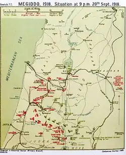 In preparation for the Battle of Megiddo, the Desert Mounted Corps, consisting of the 4th and 5th Cavalry Divisions, the Australian Mounted Division's 3rd and 4th Light Horse Brigades, concentrated near Ramleh, Ludd (Lydda), and Jaffa. Here dumps were formed of all surplus equipment, before the brigades and divisions moved up close behind the XXI Corps infantry divisions, near the Mediterranean coast.[3][4][5]