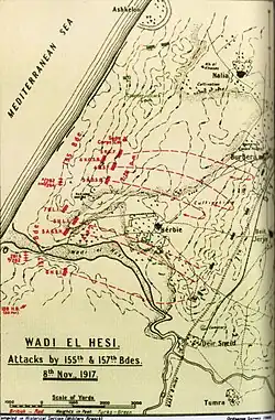 Holding the southern sector, the 157th Brigade was ordered at 13:30 to attack "with its whole strength", leaving no units to strengthen their northern flank.[56] The 157th Brigade was to attack through Herbie to capture the southern edge of Sausage Ridge overlooking the Ottoman Palestine railway which ran from Beit Hanun to Junction Station. The 5th Argyll and Sutherland Highlanders and the 5th Highland Light Infantry were to extend "along the southern end of the Ras Abu Ameire Ridge" advancing frontally, while on the southern bank of the Wadi el Hesi, the 6th Highland Light Infantry was to cross the wadi southwest of Sausage Ridge, in a turning movement.[57] The 157th Brigade, advanced unopposed until they were three-quarters of the way from Herbie towards the Sausage Ridge, at dusk they suffered considerable casualties from heavy rifle and machine gun fire.[55]