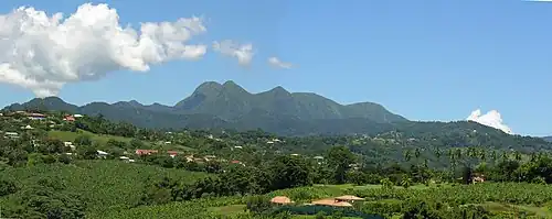 ![]() Pitons de Carbet as seen from the Route de la trace linking Fort de France to Morne Rouge. From right to left: Piton Lacroix, Piton Dumauzé and Piton de l'Alma. | |