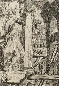 Despite being intensely personal imaginative creations, for Piranesi "a source of self-analysis and of creative release",[3] aspects of the Carceri draw on Piranesi's early training as a set designer for the stage; prison scenes were often called for. Surviving drawings for complicated sets by Filippo Juvarra and Ferdinando Bibiena (both primarily architects) as well as others have evident similarities to the prints in their receding spaces and disappearing staircases. Number XI in the series is also very similar, in reverse, to a Piranesi drawing Study for a palatial interior in the British Museum.[4]