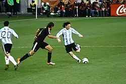 Already frequently compared to compatriot Diego Maradona, Messi proved their similarity when he nearly replicated Maradona's two most famous goals in the span of seven weeks.[39] On 18 April, in a Copa del Rey match against Getafe, he ran 60 metres (66 yd) with the ball, beating five defenders before scoring with an angled finish in a remarkably similar fashion to Maradona's Goal of the Century.[40][41] A league match against Espanyol on 9 June saw him guide the ball past the goalkeeper with his hand in similar fashion to Maradona's Hand of God goal.[42] As Messi continued his individual rise, Barcelona faltered; the team failed to reach the Copa del Rey final after Messi was rested during the second leg against Getafe and lost the league to Real Madrid on head-to-head results.[43][44]