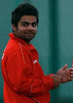 Prior to the 2011 season of the IPL, Kohli was the sole player retained by Bangalore, for an amount of US$1.8 million.[308] In the opening match against the Kochi Tuskers Kerala, Kohli started his campaign with a score of 23 runs.[309] He registered his first half-century of the season against the Deccan Chargers, in pursuit of what was then the second-highest run chase, however Bangalore fell short by 33 runs.[310] After lacklustre start for Bangalore, winning two out of their first six matches, Kohli scored 56 runs in the next match against the Delhi Daredevils, and was awarded the player of the match for the first time in the tournament.[311] In the subsequent match, he continued his form against the Pune Warriors, where he claimed his second player of the match award. It was during this match that Kohli became the leading run-scorer of the season, donning the Orange cap for the short time, and he also surpassed the milestone of 1000 runs in the IPL.[312] During the mid-tournament, with regular captain Daniel Vettori sustaining an injury, Kohli had the opportunity to captain his side for the first time in an IPL match.[313] Team's coach, Ray Jennings praised Kohli for his efforts, acknowledged his potential to become the future captain not only of the franchise but also of the Indian national team.[314] The team ended their league stage campaign on a high note, defeating the Chennai Super Kings and securing the top position on the points table.[315] In the first qualifier, Kohli scored 70 off 44 balls. Setting a target of 175 runs, Bangalore failed to defend, resulting in knockout match against the Mumbai Indians.[316] In the knockout match, Bangalore triumphed over Mumbai, securing their place in the IPL final for the second time. In the final, chasing a target of 205 runs, Kohli contributed 35 runs to the team's total. However, Bangalore once again fell short in their pursuit of the title.[317] During the season, Kohli amassed 557 runs, including four half-centuries, and earning the distinction of being the second-highest run-scorer of the season, trailing West-Indian teammate Chris Gayle.[318] In the Champions League, Bangalore encountered a defeat in their first match against the Warriors. In the following match, Kohli got dismissed for a duck, leading to another loss for Bangalore. To secure a spot in the semi-finals, they needed to win their remaining two matches. In their last group-stage match against the Southern Redbacks, Kohli showcased his aggressive batting by scoring 70 runs off just 36 balls, propelling Bangalore into the semi-finals.[319] In the semi-final clash against the New South Wales Blues, Kohli once again played match-winning innings, scoring an unbeaten 84 runs.[320] However, in the final showdown against the Mumbai Indians, Bangalore suffered a defeat by a margin of 31 runs.