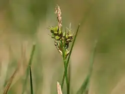 The inflorescence comprises a single, terminal, male (staminate) spike, and 2–4 lateral female (pistillate) spikes.[3] The spikes are clustered together, and the whole inflorescence is 1–4 cm (0.4–1.6 in) long.[3] The female spikes are 4–8 mm (0.16–0.31 in) long, ovoid or approaching spherical,[3] and contains 5–15 flowers.[4] The female spikes are attached directly to the stem, and each is subtended by a bract which does not form a sheath.[3] The male spike is 8–15 mm (0.3–0.6 in) long and much narrower.[3]
