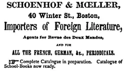 Henry James approved of Schoenhof & Moeller, describing it in 1878 as "a vastly better shop than any of the kind in London."[3] Around 1889, "Mr. Schoenhof [was] the general agent for the United States for Hachette & Co.'s (London and Paris) publications for the study of foreign languages ... [and] for Henry Holt & Co.'s (New York) publications. ... [He also sold] Steiger & Co.'s, Wm. R. Jenkins', Geo. R. Lockwood & Son's, MacMillan's, Appleton's, Barnes' publications in foreign languages."[4] Schoenhof's shop was located near the corner of Tremont and Winter Streets: at no.40 Winter St. (1875–1876),[5] no.146 Tremont (1880–1881),[6] no.144 Tremont (1887–1889),[7] and no.128 Tremont (1902–1911).[8] In 1893 he "sold out his interest to two of his employees, who continue[d] the business under the firm-name of Castor & Co."[9][10]