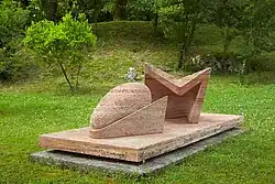 Carla Lavatelli's sculptures are in many prominent museum and private collections across the United States and Europe, as well as in public and communal spaces and university campuses. Notable examples include her first abstract work, Ginko Biloba (1971), carved from red Persian travertine, which is located in the Phillips Collection in Washington, D.C.[4] The work had been gifted to the Phillips by Lavatelli in 1974 on the occasion of her exhibition there the same year.[30] Other important works include Stele For a Prayer (1971), a monolithic work in white Carrara marble and slate in the collection of the San Francisco Museum of Modern Art.[3] Her carved stone and silver jewelry, which she called "Sculptures to Wear" are in the collection of the Minneapolis Institute of Arts.[31] Several versions of Lavatelli's large-scale abstract sculpture in bronze and stainless steel, 1 ½ (1969–70), are in the museum collections of institutions such as Stanford University in Palo Alto, California, and Brown University in Providence, Rhode Island.[6] Originally installed on the Stanford campus in front of the law school, 1 ½ was restored in 1996 by Lavatelli and relocated in the Fairchild Chapel.[32] At Brown, 1 ½ has been on view in front of the brutalist high-rise Science Library building since its installation in 1985.[33] Bill Van Siclen, an art critic for the Providence Journal, remarked in a 2007 article that Lavatelli's 1 ½ resembled a “giant chrome-plated engine part,” and that “had she not become a sculptor, [she] clearly had a future as a sports car designer.”[34] In 1978, Lavatelli was commissioned to permanently install a spherical bronze sculpture in a newly created pond at the Botanical Gardens in Freiburg, Germany, which she titled Golden Pond.[35] During the 1990s, she worked on several temporary and permanent site-specific installations, including "happenings" involving paper and reed sculptures in Pistoia, Italy, and New York. In 1995, the town of Mougins, in France, commissioned her to create a stone bench installation with a fountain set into a rough-hewn travertine in Place du Banc des Amis off the Rue d'Eglisse.[36] On the occasion of the unveiling of the sculpture, Lavatelli was presented with the town's honorary Gold Medal in 1995.[1]
