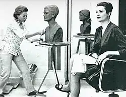 Carla Lavatelli was born in Rome, Italy, in 1928. She spent much of her childhood in different parts of Africa.[18] She returned to Italy at the end of the World War II to study literature at Ca' Foscari University of Venice.[19] In Venice she met and married an American man and moved to California. She subsequently divorced and returned to Italy, where she settled in Rome and began a practice of creating sculptural portraits. A self-taught artist, Lavatelli was commercially successful, securing several important commissions for notable sitters, including Grace Kelly, Princess of Monaco, and her three children in 1969.[19][20] In 1981, she married former Italian Formula 1 racecar driver Roberto Vallone and relocated to Harris County in Texas.[21] In the late 1960s and early 70s, Lavatelli participated in the “Officina Cidonio,” a non-profit organization in the Tuscan town of Pietrasanta for artists who sculpt in stone founded by Erminio Cidonio. Cidonio had previously invited prominent sculptors such as Henry Moore, Jacques Lipchitz and Jean Arp to have their work enlarged in the Henraux workshops in Querceta in the 1950s.[22] In Pietrasanta, Lavatelli, the only female artist invited, worked alongside famed sculptor Isamu Noguchi and met with Moore, Lipschitz and Marino Marini.[23] Upon Cidonio's death in 1971, Lavatelli purchased and restored a 16th-century olive mill in the nearby town of Camaiore, which became her home and studio for the next four decades.[24]