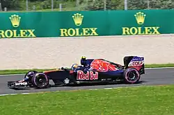 Sainz drove for Scuderia Toro Rosso in the 2015 season where he partnered Max Verstappen, following Daniil Kvyat's promotion to Red Bull.[13] Sainz selected 55 as his race number. He qualified inside the top ten for his debut, the Australian Grand Prix, and finished the race in ninth position.[14] He scored points again at the Malaysian Grand Prix, but failed to score at the Chinese Grand Prix after spinning and then retired from the Bahrain Grand Prix with a wheel issue. He qualified fifth at the Spanish Grand Prix, his highest grid position of the year, and finished the race ninth. He was forced to start the Monaco Grand Prix from the pit lane after failing to attend the weigh-bridge during qualifying. He recovered to tenth place in the race.[15]