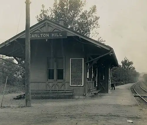 Carlton Hill station was a railroad station for the Erie Railroad in East Rutherford, New Jersey, United States. Carlton Hill station was the second station along the Erie's main line and the first station after Rutherford Junction, where the Erie's main line forked from the Bergen County Railroad. The station provided service for passengers in Rutherford and East Rutherford's Carlton Hill district and freight billing for the Royce Chemical Company, producer of Royox household cleaner, epoxies and dyes.