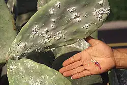 Carminic acid is commonly harvested from an American species scaled insects called Dactylopius coccus (or cochineals).[10][11] Cochineals are parasitic scaled insects which are abundantly found on their host plants, the prickly pear cactus native to Mexico and South America.[12] The insects are either cultivated or harvested from wild populations, mainly for the wingless females of the species which attach themselves to the cactus and outnumber the winged males of the species two hundred to one.[13] Classically, cultivated species were grown from eggs placed by workers onto the cactus leaves and left to grow. There the female cochineals would remain immobile for about 3 months until being brushed off, collected, and dried for shipping.[13] Females possess concentrations of about 1.5% bodyweight of carminic acid and newborns about 3.0%.[10] The carminic acid is then extracted by soaking the dried cochineals in water, and additives are then added to alter dye colour and enable the dye to adhere to objects.[12]
