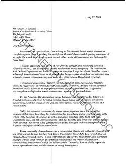 20. ^ "Naval Officer's Letter Accuses Newspaper Reporter of Sexual Harassment". Fox News. 2009-07-25. Archived from the original on 2012-10-23. The letter — the online copy isn't written on official letterhead — alleges that on "multiple" occasions in the last year, reporter Carol Rosenberg "made abusive and degrading comments of an explicitly sexual nature" against Gordon and others at Guantanamo Bay and Andrews Air Force Base.