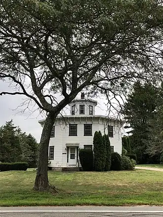 The mill complex deteriorated after its closure, and Carolina became a residential community.[3] However, other components of the village remained intact and it was listed on the National Register in 1974. The portion of Carolina village which is located in the town of Richmond includes a corridor of about two dozen 1-story and 1½-story cottages and other domestic buildings built between about 1840 and 1870. Other buildings of historic interest include the remains of the mill; the Carolina School, built in 1845; the Carolina Free Will Baptist Church, built in 1845 and relocated in 1865; the octagonal Albert Potter House, built in 1867; and a 2½-story Queen Anne style house built by Ellison Tinkham, who was one of the owners of the mills from 1868 until 1907.[2][3]