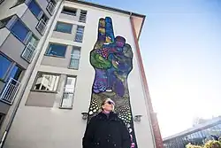 Falkholt has had solo exhibitions at Gothenburg Museum of Art,[5] Eskilstuna Museum of Art,[6] Ystad Art Museum, Steneby Konsthall in Dalsland and Klippans konsthall in Skåne.,[7] among others. In 2013, she was one of the participants in the Sveriges Television program Konstkuppen and that same year she curated and participated as an artist in the exhibition Mynningsladdare (Muzzleloader) at Röda Sten Konsthall in Gothenburg.[8] In the same year, she participated in the X-Border biennial with the project Firewall with paintings in the three towns Severomorsk, Rovaniemi and Luleå and made the 16-meter long piece Wet Paint at The House of Culture (Stockholm) in Stockholm. Falkholt is represented by, among others, Gothenburg Museum of Art, Skövde Museum of Art and Halland Museum of Cultural History.[9] In 2014, she made the painting Övermålning (Overpainting) as a commission for a highschool in Nyköping. She started by writing derogatory words towards women on the wall and then painted them over with a stylized motif of the lower part of a woman's naked body. The artwork created a heated argument which was covered in media, both in Sweden and internationally.[10] At one point politicians took the decision to build a wall in front of the painting. But Falholt and the painting had many strong supporters. The principal of the school said: "I see many pedagogic advantages to having her art in the school".[11] After much debate the wall in front of the painting was taken down.[12] In connection with this debate she made a performance at Konstakademien in Stockholm, where she invited politicians to Skenbröllop, a sham marriage with her. Two politicians said yes, Marita Ulvskog (Swedish Social Democratic Party) and Sissela Nordling Blanco (Feminist Initiative).[13]