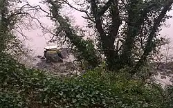 The tomb is nearly submerged at the high tide mark, as is the accompanying cairn. The tomb is made of three upright stones largely covered in seaweed and a capstone. It faces east.