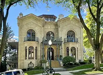 Some architectural historians have classified the house's style as Romanesque Revival. Others have placed it in the Rundbogenstil category, which means "round arch-style" and is an eclecticizing variation of Romanesque Revival originating in Germany.[4] It is characteristic of this style that many of the windows have round-arched frames within larger arches. At the top of the second story are ranks of fine dentils, also a hallmark of Rundbogenstil. The Italianate belvedere above the center flat bay reflects the style's indebtedness to Tuscan architecture.[5]