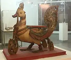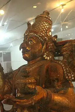 Vahanas or "vehicles" of Hindu Gods are mythical characters having significant religious value. Temples in India use depictions of these vehicles in many forms during temple processions. National Museum, New Delhi houses a collection of Carved Wood Vahanas in the gallery of decorative arts. This collection at the National Museum is unique among museums in India, which includes large images of Garuda, Hanuman, elephant, horse, swan and lion and these artefacts are mostly from the period between the 17th and 20th century.[1] Ancient Indian temples house numerous kinds of wood carvings having religious context to be used for various temple activities. The majority of Vahanas are made of wood and decorated with designs made with varied techniques. Vahanas have been mentioned in temple inscriptions dating back to the 13th century.[2]