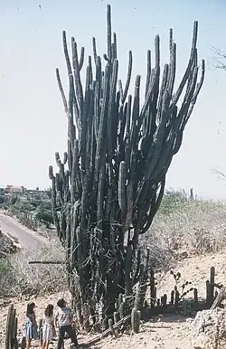 Wood pieces are placed atop of the poles to support the roof beams. Roofs were commonly constructed using maishi chiki (Sorghum bicolor), signalgrass (Brachiaria mollis), palmtree leaves (Arecaceae), or maize stems, locally referred to as chosa (before c. 1815).[15] This type of roofing is still found in Curaçao and Bonaire. Another method of roofing came in fashion in Aruba (after c. 1815), namely the whitening of these torto roofs. This method appears to have been introduced by groups of Spanish refugees who were expelled from Venezuela during the Venezuelan War of Independence and settled in Aruba.[1][13] These turtle-shaped roofs completely replaced the roofs covered with maize stems and are unique to these islands. To support the roof, roof rafters were installed on each pair of wall uprights, with a ridge height of approximately 1.20 metres (3.9 ft) and a roof pitch of around 50°. Fibrous skeletal strips of the candelabra cactus (Cereus repandus)[16] were utilized as roofing material. These cacti strips were either directly attached one by one to the rafters or first bound together with rope to create mats, which were then secured to the roof rafters. The outer surface of this cacti roofing was finished with the same torto used for the walls, and a final layer of white lime was applied.[13]