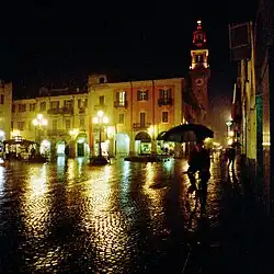 Piazza Castello is a large irregularly shaped open space used as a car park and as a market square; it is dominated by the castle of the Paleologi which occupies most of its western side. The square arose in 1858 through the demolition of the castle's eastern ravelin and was extended in the late nineteenth/early 20th century when the remaining ravelins were removed.