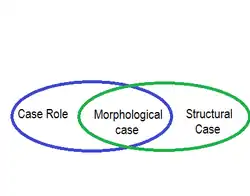 The semantic category of case (specifically case role) is related to morphological case. Morphological case (such as accusative, ergative, dative, genitive, and sometimes also partitive) reflects the ranking of arguments, while semantic case (such as instrumental, comitative, locative, and directional) encodes a semantic relation between the DP and the governing head.[8] Morphological case is typical of complements and is licensed by structural Case. By contrast, semantic case is typical of adjuncts; it is only licensed by the meaning of the head.[8] From the case roles proposed by Fillmore (1968),[7] it was demonstrated that case roles appeared where the morphological cases of dative, genitive or instrumental appeared: